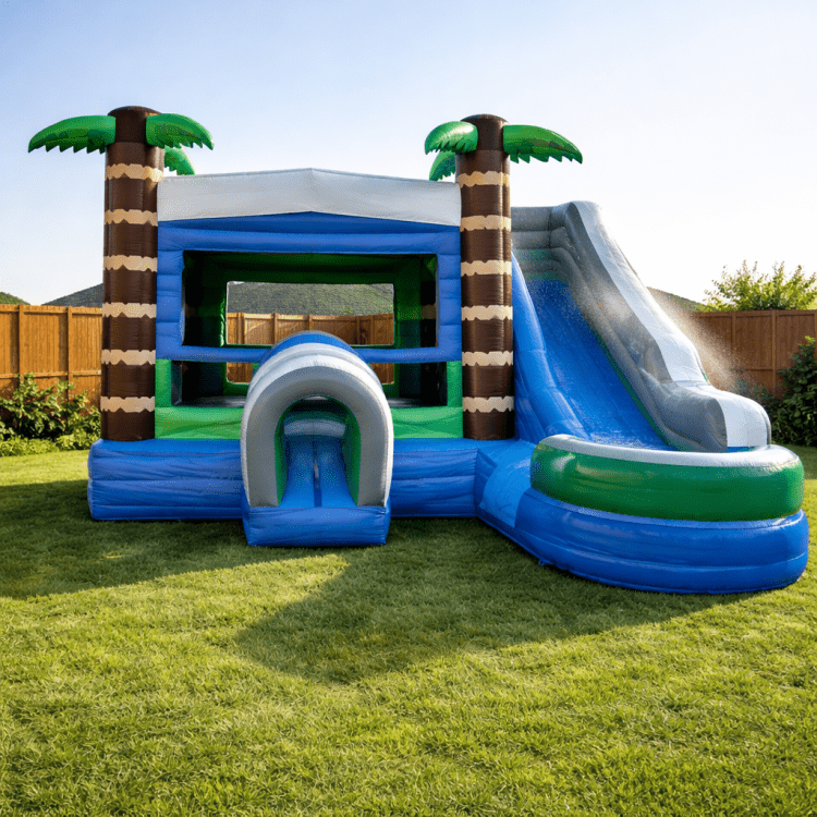 Bring island-style excitement to your next event with our Tropical Wet / Dry Bounce House Water Slide Combo. This colorful inflatable combines the nonstop energy of a bounce house with the added thrill of a climbing area and slide, creating one all-in-one centerpiece for backyard parties, birthdays, school events, and summer celebrations.