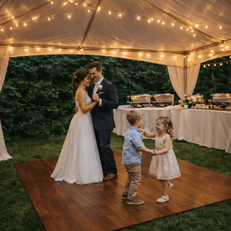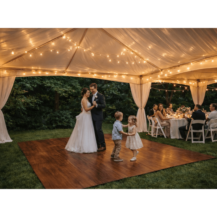 Anchor your event space with the warmth and elegance of our Cherry Wood Plank Dance Floor. Featuring a rich, reddish-brown wood grain finish, this floor provides a stunning contrast against white tents. The 12' x 12' size is our most compact option, designed specifically for intimate gatherings, backyard birthday parties, or smaller indoor venues.